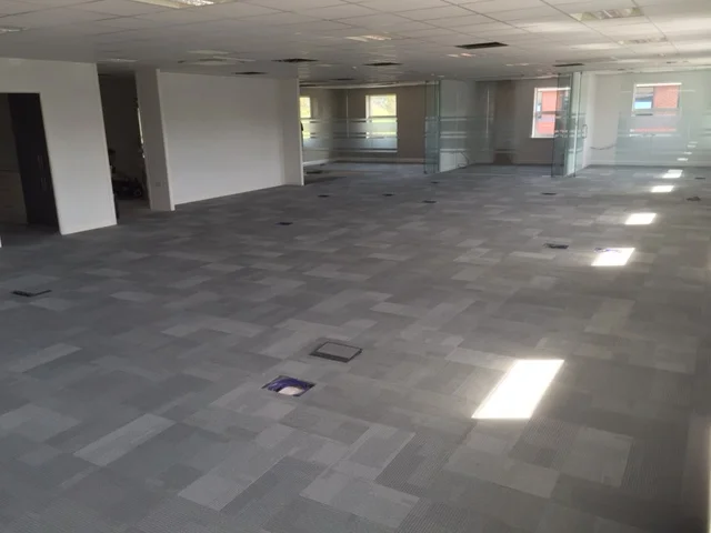 Curved walkway with carpet tiles flush to both sides.